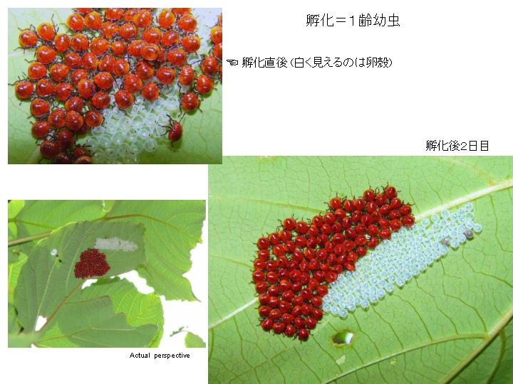 卵は産付後、10−12日で孵化します。孵化は各卵一斉に始まり、そして一斉に終わります。1齢幼虫の誕生です。