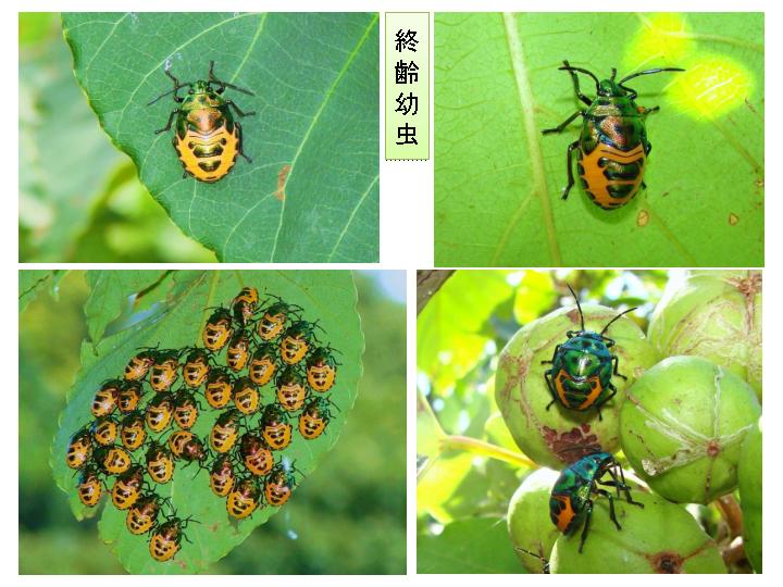 アブラギリの実に口吻を突き立てて、盛んに吸汁する5齢幼虫。(右下)
